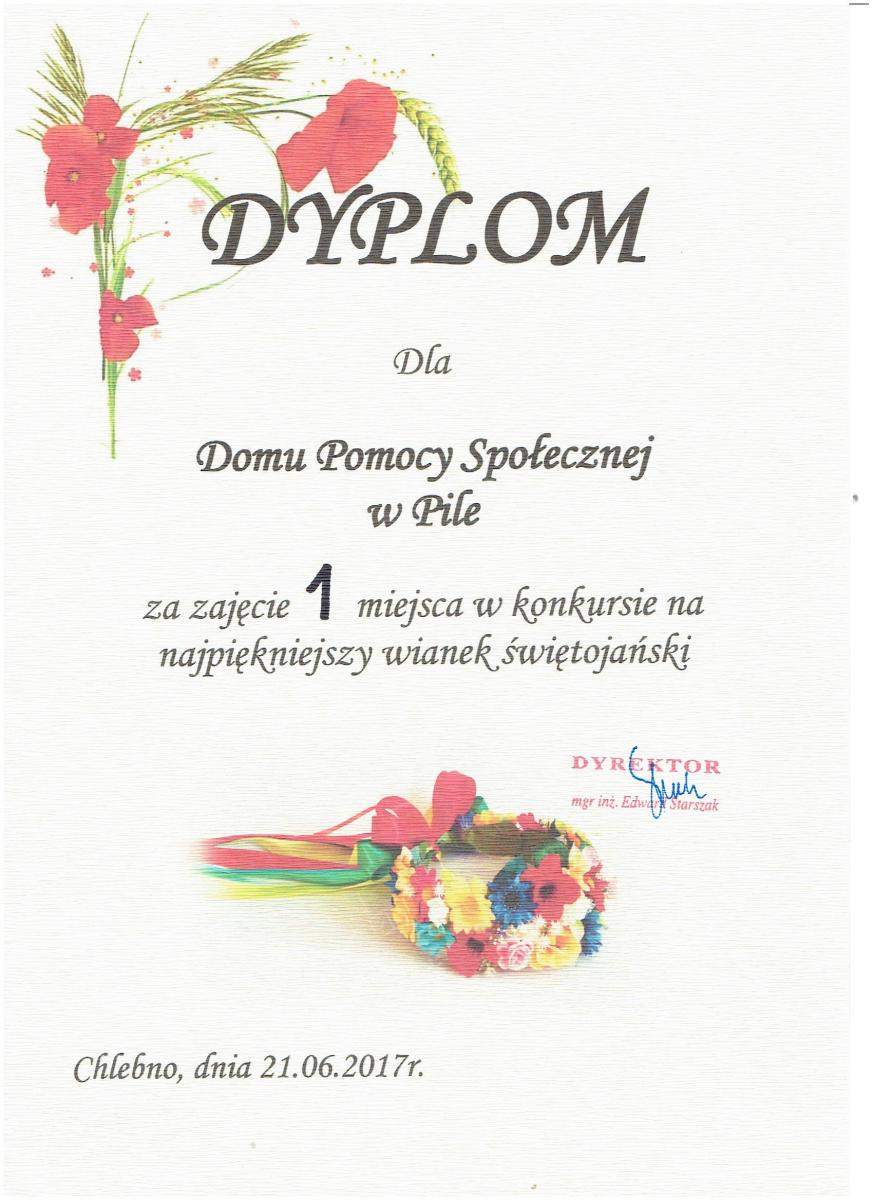21.06.2017 roku w Domu Pomocy Społecznej w Chlebnie odbył się festyn „Świętojanki 2017” na który została zaproszona delegacja mieszkańców naszego Domu. Podczas festynu zorganizowano konkurs na wianek świętojański w którym nasi mieszkańcy zajęli pierwsze miejsce.