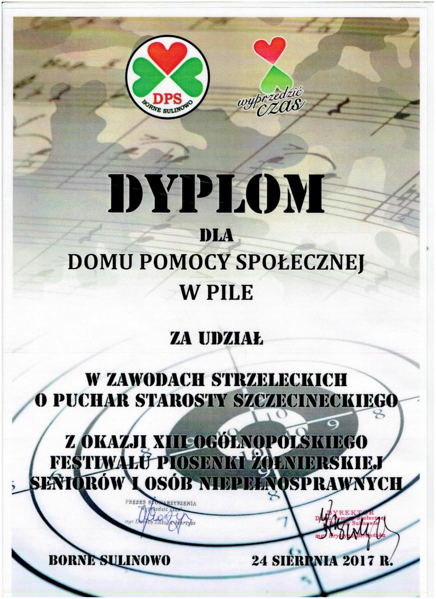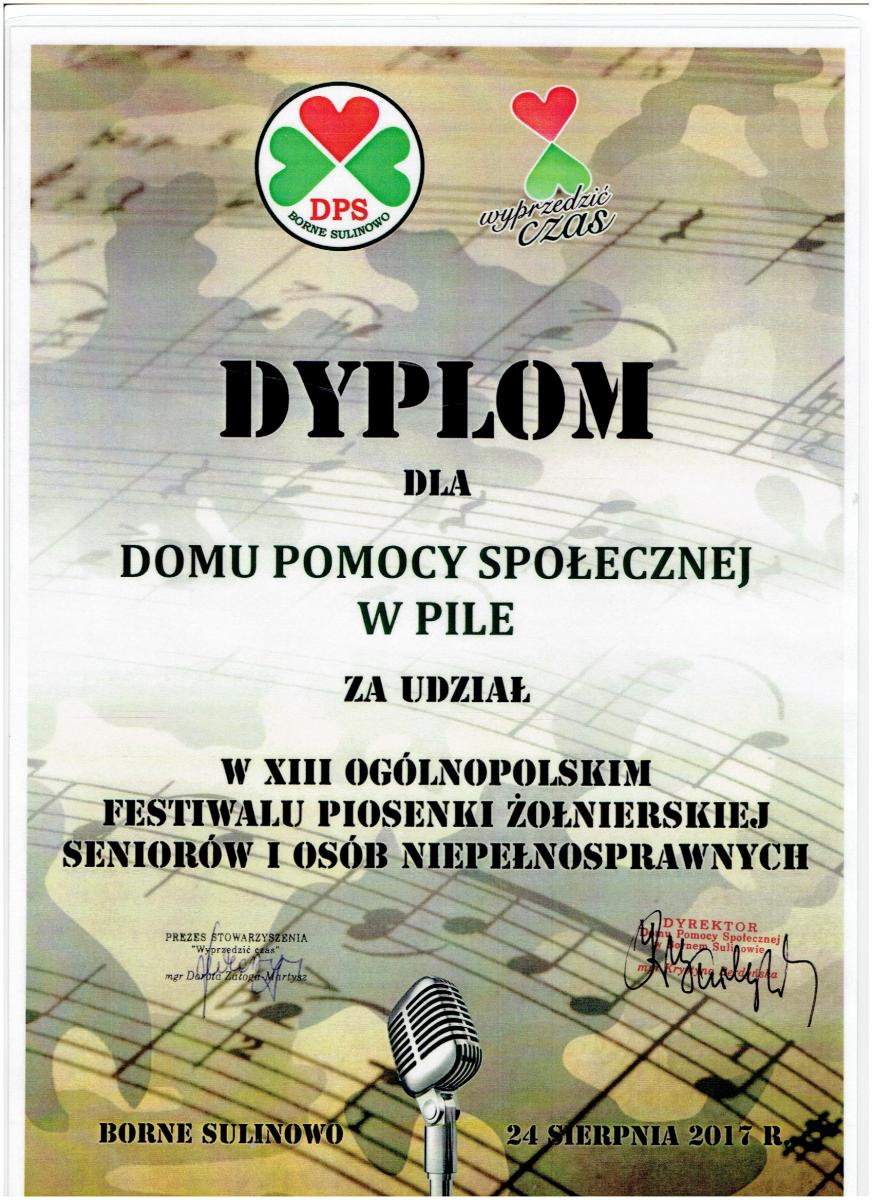 Dnia 24.08.2017 roku w Domu Pomocy Społecznej w Bornem Sulinowie odbył się XIII Ogólnopolski Festiwal Piosenki Żołnierskiej Seniorów i Osób Niepełnosprawnych. Podczas Festiwalu zaprezentowało się 30 zespołów z różnych placówek.
