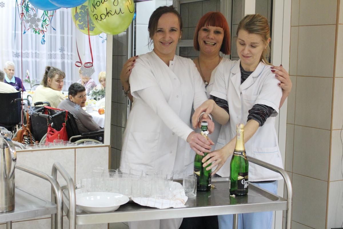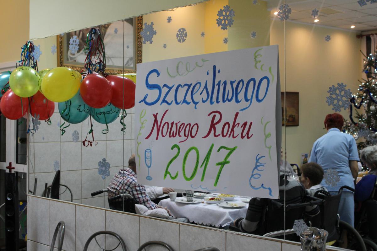 Dnia 31.12.2016 roku w Naszym Domu odbyła się uroczysta kolacja Sylwestrowa. W karnawałowym wystroju przy muzyce nasi mieszkańcy pożegnali stary 2016 rok lampką szampana witając Nowy 2017 rok.